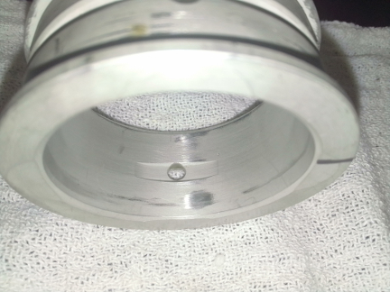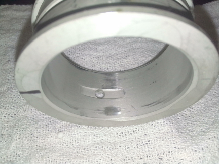 a cutter of appropriate with and diameter.AT RIGHT: Here's the bearing we created installed. Note the slot supplying oil from below (here "above") and no case hole matching up with the bearing's hole. Note that our new bearing has the beveling discussed in the text but because of the way we created our notch to receive the oil, the bevel doesn't widen at the notch, rather deeper in. (There's more about this in the text below.)