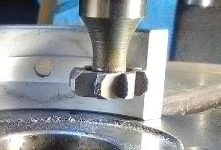 BELOW: Here we perform the cut. Note the bevel we've been talking about above is here clearly visible in the right-most flat end of the bearing and, indeed, in the cutting tool itself. Note also that this cutter cuts in a clockwise (from top) direction and so we're rotating the table into the cut. Often one might do it the other way, but in this instance we want to start the cut on the flat end for easy measure of our depth of cut - it will only get shallower from here - and we want to not be cutting into the flat end with the cutting tip as it could alter the position of the work piece.