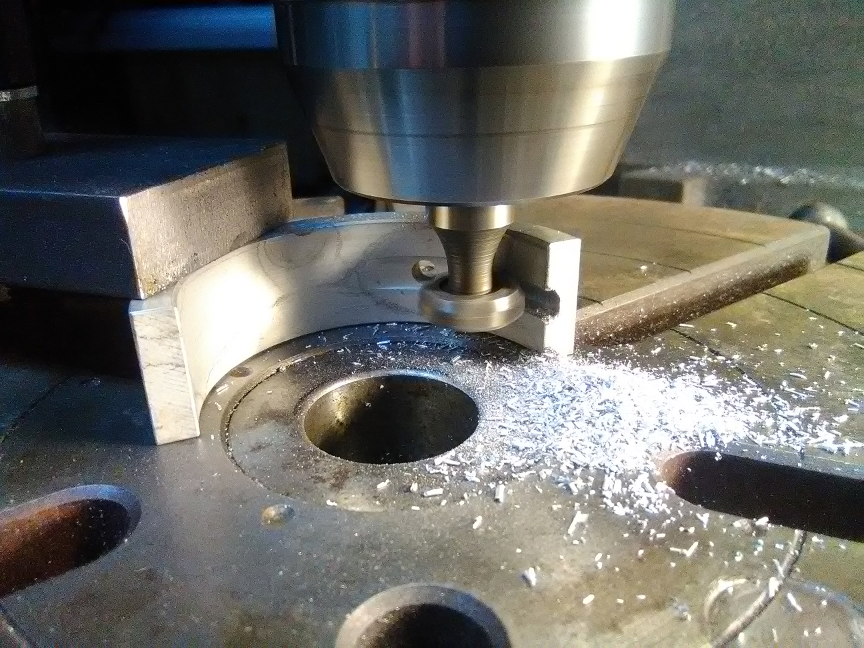 The setting of the height is a snap for anyone familliar with a milling machine - just match the height of the existing oil-spreadder groove that all main bearings have and lock it down. And, because it's a rotary table, it's a snap also rotate the table to be aligned in the fore-aft direction and use the cross-feed of the table to move the whole assembly so cutting can begin on the flat end as intended.