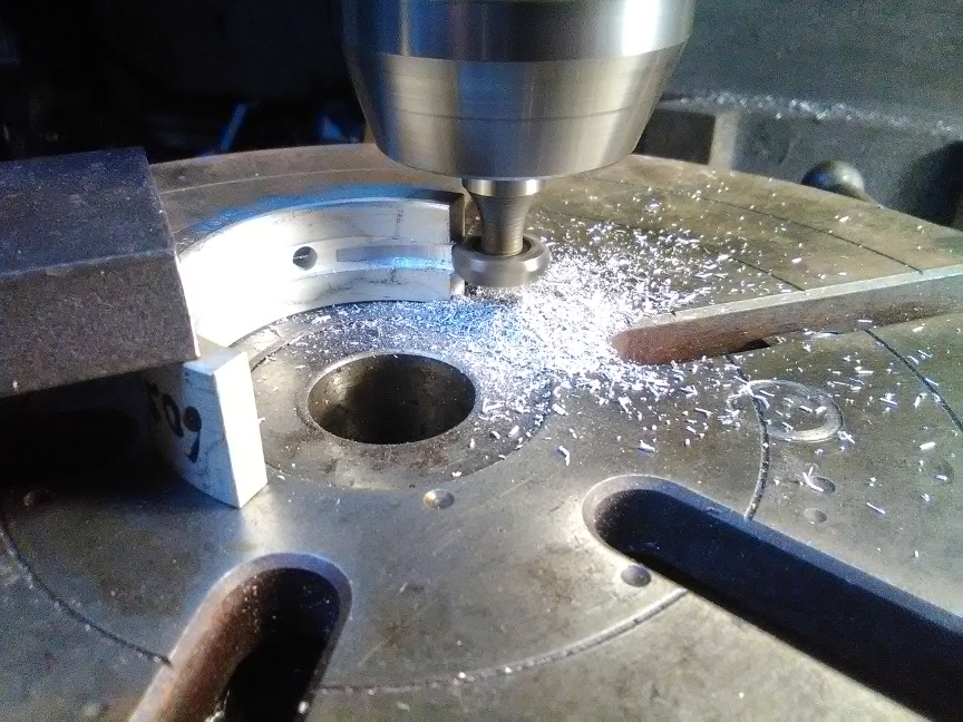 Note that the slot in the rotary table that's nearest the flat end we started the cut at was originally alligned more or less exactly in line with the fore-aft feed of the milling machine's table. So, we started cutting the depth with a good idea of how far we were going just by feeding the table into the cutter, thus helping ensure we didn't go too deep.