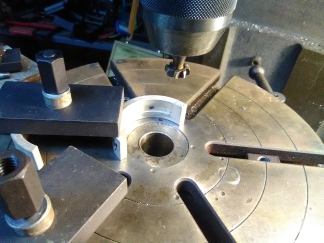 Here we presume that the reader is familliar with their milling machine and how rotary tables work. However, it's important to note that if you're using a drill press instead of a milling machine, you can still do the job with only a rotary table, but you'll have re-mount the bearing to present the flat end of the bearing for making the notch. Or, you can hand-file the notch, or create it by other means, as you see fit, but the same note above applies about avoiding 90° corners.