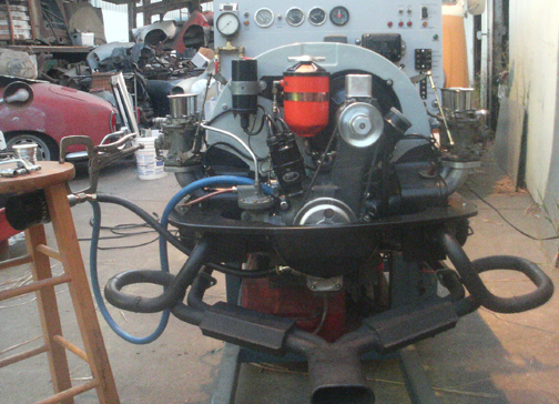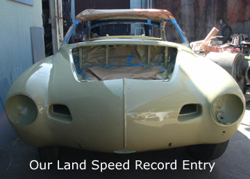 So, we got our butts in gear and put together the 1959 Karmann Ghia pictured at right. We decided to power it with the legendary Denzel engine, but at the time there were only three other known running examples in the world, and we didn't have all the pieces. It was very difficult and we made it to the Bonneville Salt Flats just barely in the nick of time, and proceeded to set new records straight away. And so it came to pass that at 50 years of age, this Ghia set a world-record and at least seven "firsts."