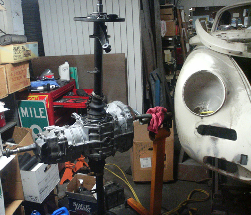 our Transaxle: This is where the primary assembly took place, next to a Porsche 356 B Cabriolet (1600S) that's in the process of restoration. This photo was taken after everything but the brake assemblies had been installed. It actually took about 4 core transaxles from three different decades of production for us to select all the right parts.