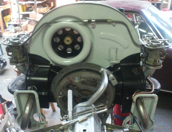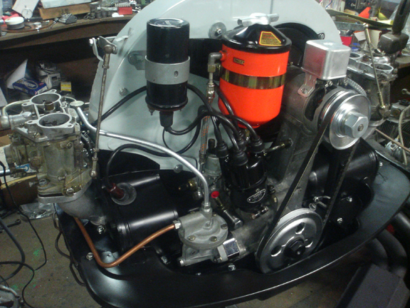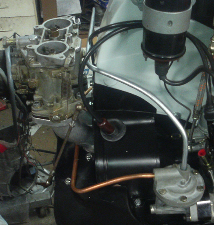 Yes, the mechanical pump in the engine bay is just to route lines! It would work but we took the pushrod out in order to save power - using an electric pump takes less HP. That silver thing is a pressure regulator - Solex carbs don't like much pressure, just about 2 lbs; more and the float valves will not handle it.