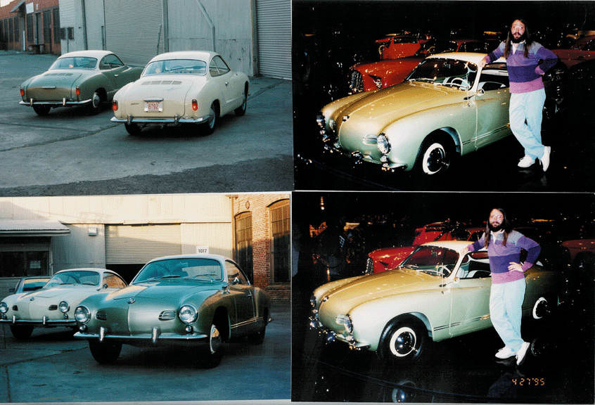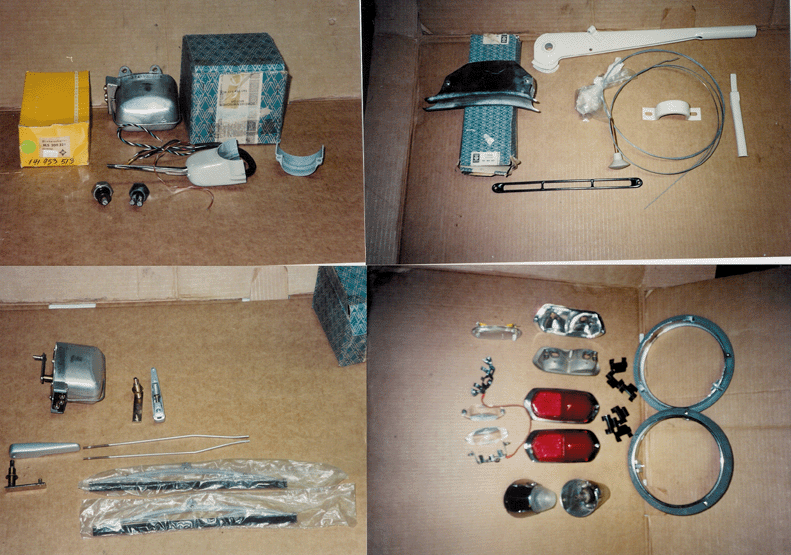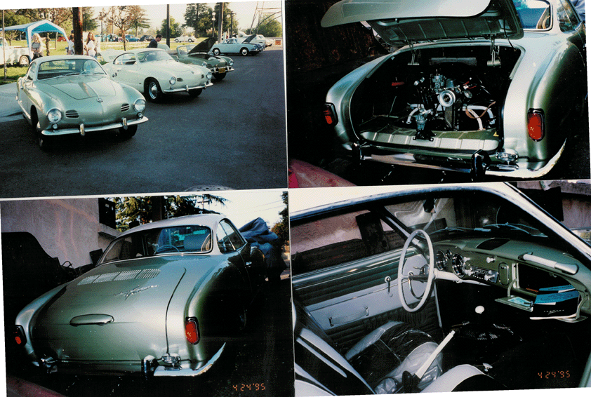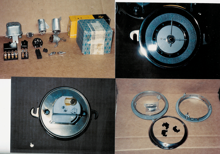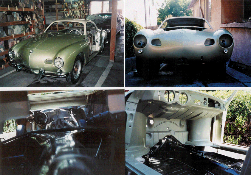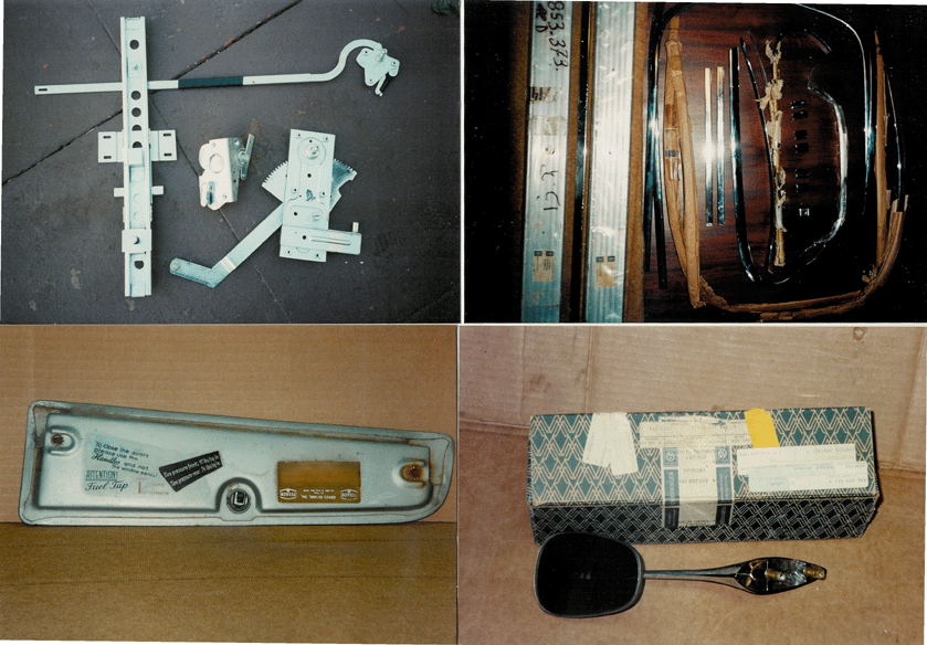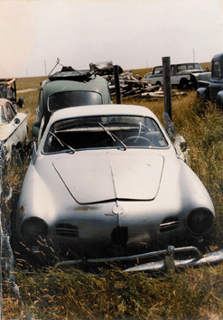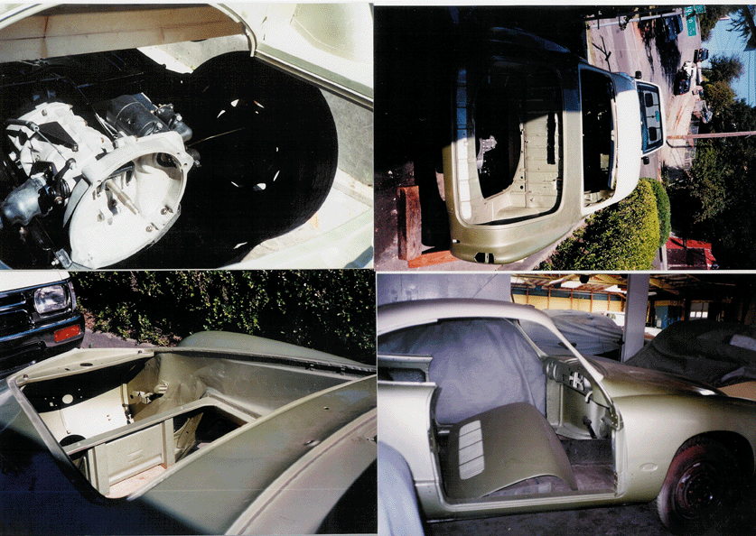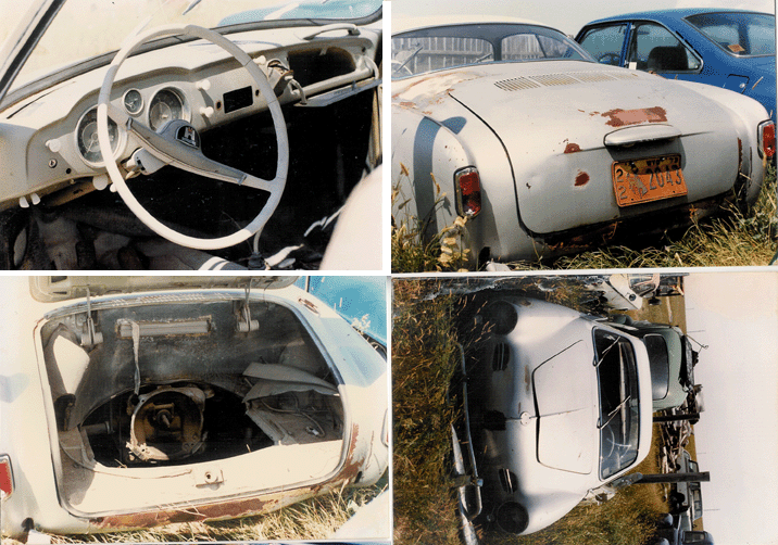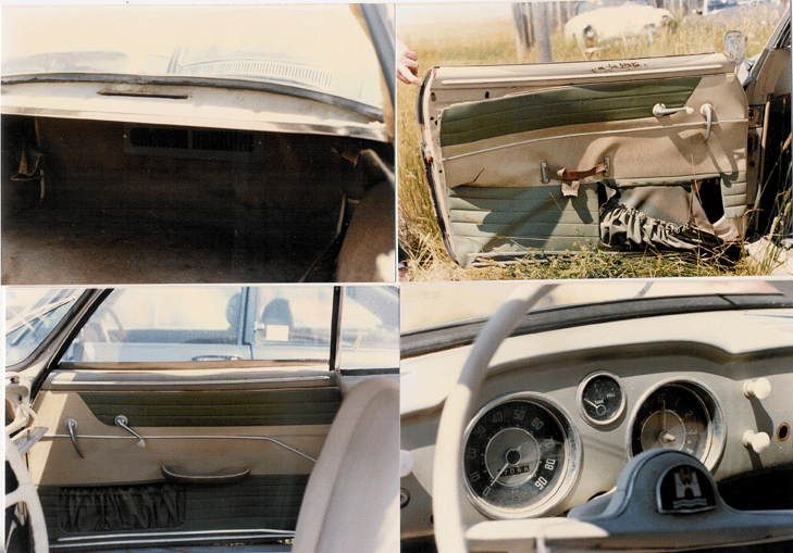 These photographs document this vehicle's complete restoration at our hands. At the top and bottom are some photographs of the completed vehicle, and in between are images showing the parts and process, including where the vehicle was first discovered, abandoned in a field.