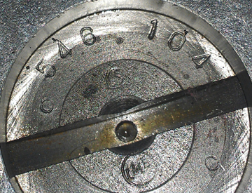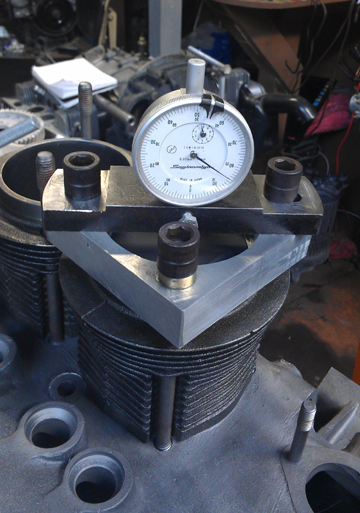 If you can't read the dial face in the image at right, the distance between the smallest tick marks is one hundredth of a mm, or 0.0004", and you can discern to perhaps a tenth of that! So, this is a very accurate measure, performed while the cylinder is under torque, so any shims are squished flat, etc.