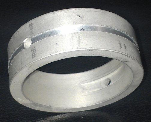 I was so delighted with how it worked out, I immediately proceeded with cleaning and assembly, using the bearings just fabricated, and didn't think to take a photo of them - the Repco bearings... However, here is the first pair, the "inked set". Note how the freshly cut surface blends in with a smooth transition to the un-cut areas (which retain the ink) - this set, imaged below, is not the over-sized set. Run your fingers across them and they're absolutely smooth - no "step" or edge. (Note that some ink was lost by the bore measurement gauge making contact as the ink has not "soaked in" and is easily removed by rubbing.)