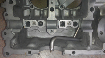 There are more checks to be made... Thankfully, the oil pickup tube is very tight in the case. (It can be challenging to repair a loose pickup tube.) And, all the threads are fine, including the rear-most two, that accept the forward pulley shroud. These are often stripped. Out of habit, I ran a tap through the pulley shroud's screw holes and cut a few more threads just to ensure there's no problem later. (Long M6 bolts should be used here - which is good advice anyway.) And, unusually, all of the sump studs are fine and needed no repair (image way below).
