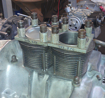 Here you can see (above right, and directly right) cylinders being fitted for height comparison check - this is done to ensure that there are no difference between the cylinder heights that the head itself "sees." The book value for tolerated error is 0.1mm (four thousandths of an inch), but in this case, there was no measurable difference between one pair, and about 0.002" (two thousandths of an inch, or 0.05 mm) for the other.