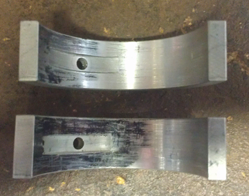 The upper image of the left two below is a bearing inked, below that is one half showing where the crankshaft rubbed (left side of image), and at right is the other half, showing a different wear point (at the parting line in the top left corner of the bearing):