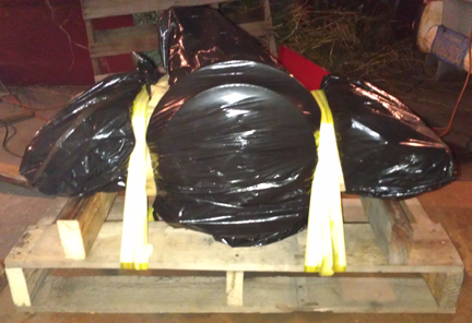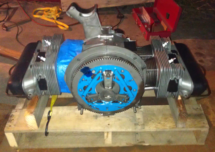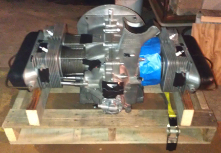 After dismounting from the engine stand, I torqued the flywheel a second time to ensure it's on good and tight. Then, I taped off all openings and brought the engine to the crating area using the over-size floor jack, whereupon I sprayed the engine liberally with WD-40 in preparation for its upcoming sea voyage.