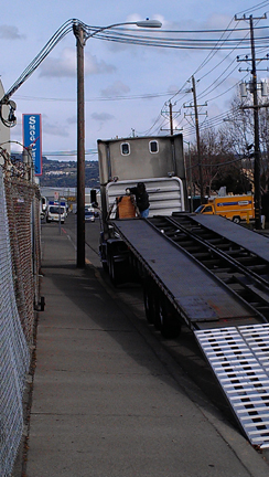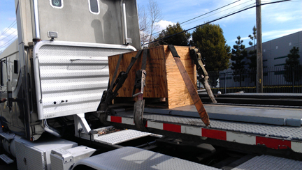 The shipper was rather prompt. As no forklift was available to help, the driver set out some ramps and I pushed the cart up onto this truck.