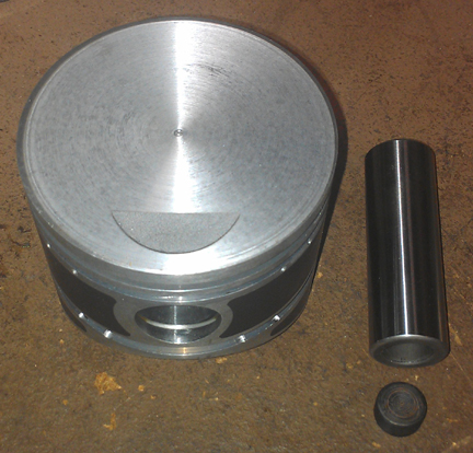 Of course, this throws off the weight of the piston, which is now much lighter than it's partners. When I say "much", it was STILL within the original specifications, which, as indicated before, are unacceptibly large from today's viewpoint. As it would be difficult to take enough material off of all three other pistons, and as there are no connecting pins heavy enough to make up the difference, I'm sure many engine builders would shrug it off and say, well, it's within spec! However, I don't built engines that are simply within specification! So, a slug of steel was made up to have an outside diameter just a tiny bit larger than the inside of the connecting pin, that slug was then ground down to a precise weight, and then it was drifted into the inside of the connecting pin. Thus, the piston / pin assembly is back to matching all the others - still within 0.1g. Perfect! (See the trimmed piston, its pin, and the "slug" above right.)