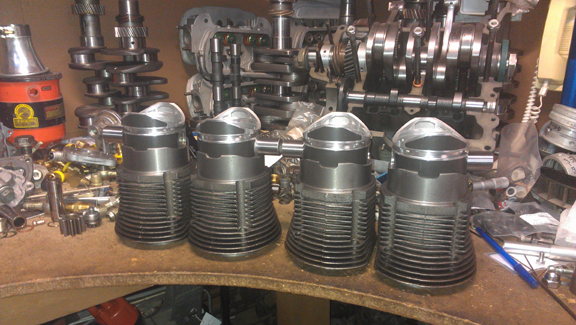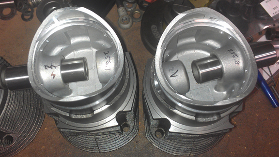 A reproduction set of pistons and cylinders is presently available for the two-piece crankcase 1500cc "normal" and I was thoughtful enough to buy a set instead of using used ones. Here they are, rings removed: