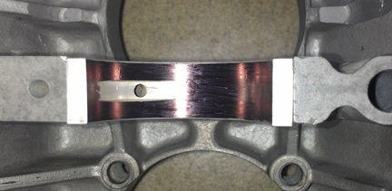 To prove this was the problem, I laid ink on the middle-main bearings - I would have used dykem, but I was out (got spilled), so I just used a black marking pen to lay down a bit of ink. I then installed the crankshaft with the middle mains inked but dry and torqued the case. Turning the crankshaft then marked the ink, as you can see in these images.