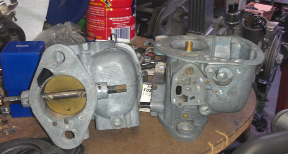 Speaking of carburetors - the carburetors are the original pair, and they're in great condition. Here they are after being dismantled for rebuilding, but before reassembly has begun: