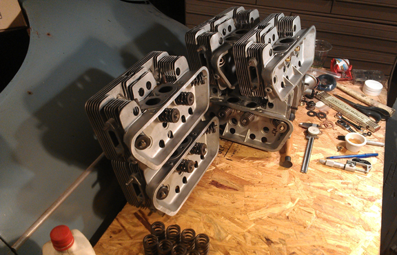 I was working on three engines at the same time and did all six heads together "as a batch" - saves a little time getting all the tools out. I didn't think to take images of each during the work, so here the images are. . . The three pair: 912, "C", and the heads for this early three piece case Super. (Can you pick out which are which?!)
