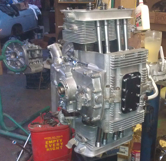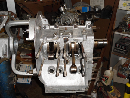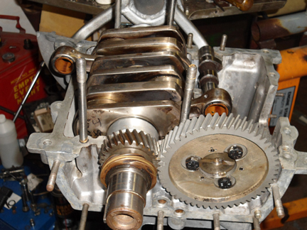 Here's the crankcase going back together. Note the original part number on the end of the cam, written in ink! This was possibly a new cam when Harry reassembled it. (Remember, in his own words, back then he was "not yet the Maestro" - should have faced those lifters!)
