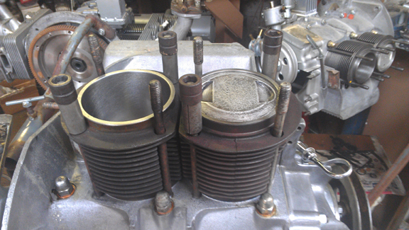 Time to install the Pistons and Cylinders. Note that Harry Pellow had apparently replaced the original chrome-plated aluminum cylinders with NPR Big-Bore pistons and they were run WITHOUT the now traditional 1mm shims under the cylinders. There were some impressions in the heads from the piston crowns and while the heads were unaffected, I didn't trust the pistons for not being cracked.