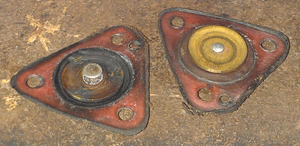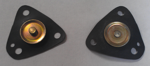 Speaking of things that aren't in the rebuild kits, this particular pair uses a triangular diaphram that's not used on all versions of this carburetor as delivered by Porsche. Though the parts manual denies this, and though the standard (Stoddard-supplied) rebuild kit S0-5K (616.08.902) does not include these, we have seen enough of these on Porsche engines that have come our way that we're sure they're original. Thankfully, there are both 32 and 40 Solex carburetor versions that use the same triangular diaphram, so they're a little easier to come by than hen's teeth. Here's the old and new pairs: