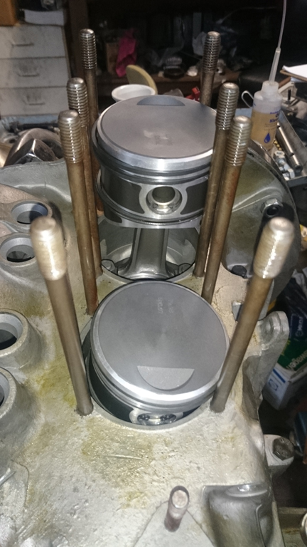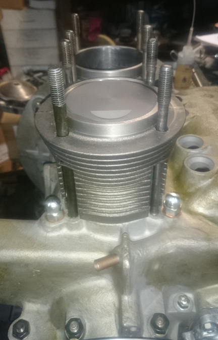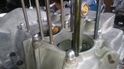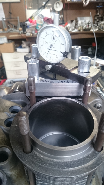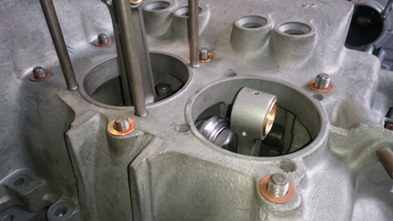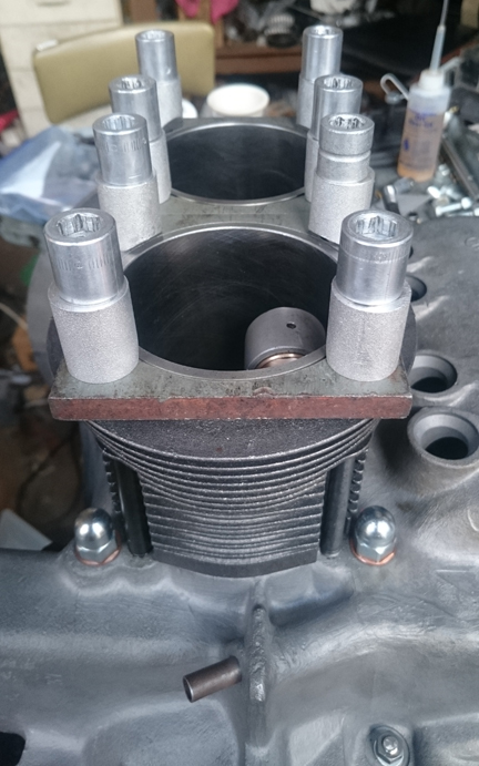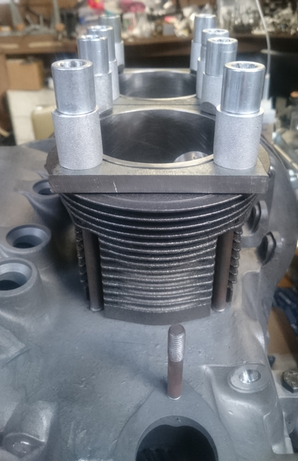 By the way, it's hard to see in the images above but the cylinders are in fact not touched on the surface that seals with the cylinder head by the clamping forces. The spacers between the head nuts and the retaining flanges are under cut so they don't touch the head. If you look at the studs & spacers in the background this becomes more clear.