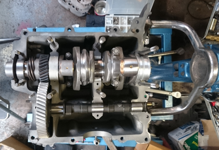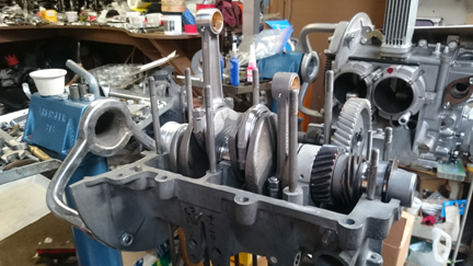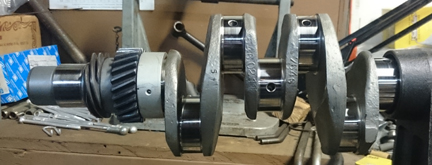 ABOVE RIGHT: The crankshaft mounted in the crankshaft stand, polished, bearing 3 and gears mounted, awaiting rods.