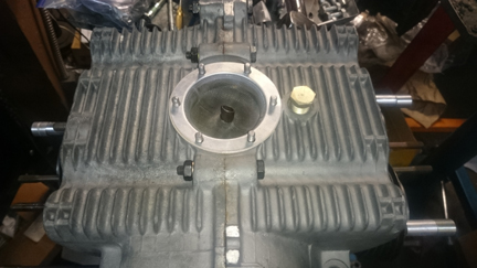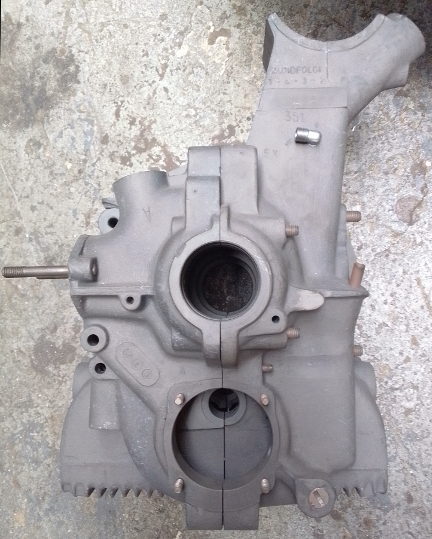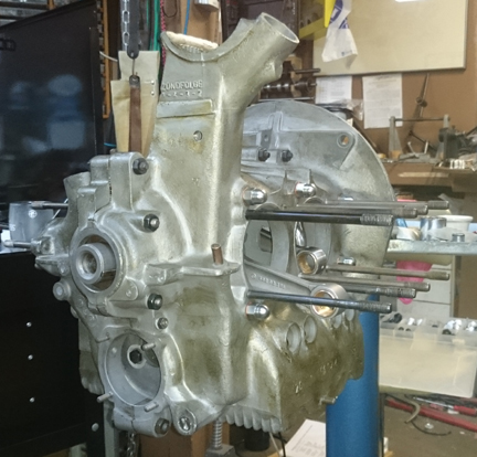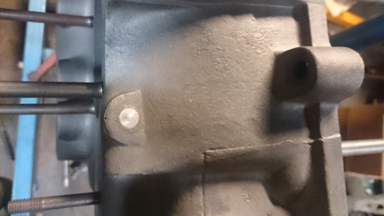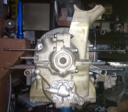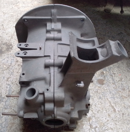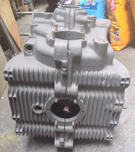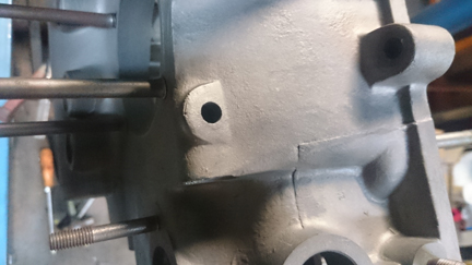 BELOW, LEFT & RIGHT: The case here has been cleaned and gently media blasted. The soft plugs have been taken out as described above to ensure all the media got out. The sharp-eyed reader will notice the right hand pulley shroud mounting boss has been welded up. This was done, obviously, to fix a problem with that screw's threads. It's not yet tapped but we'll get to it before assembly begins.