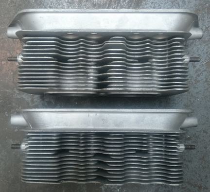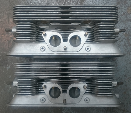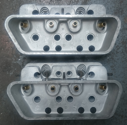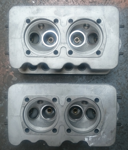 These heads are in great condition and, remarkably, it does appear they were actually originally paired together from new! The guides were of the 10mm variety, but they still had bronze seats in them. (Bronze seals well but wears out quickly. Also, bronze can't take the unleaded fuels we have today.) The only flaw I found was one crack in a lower fin. I welded up the crack and smoothed it off - you can see the result in the lower head below left.