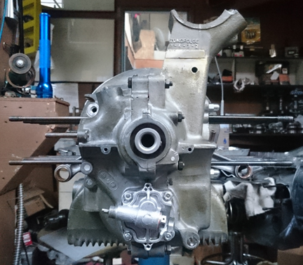 One the crankcase preparation was complete, the crankshaft assembled, and cam gear selected - as described above - it's almost done! Here, the left half is completely ready for assembly.