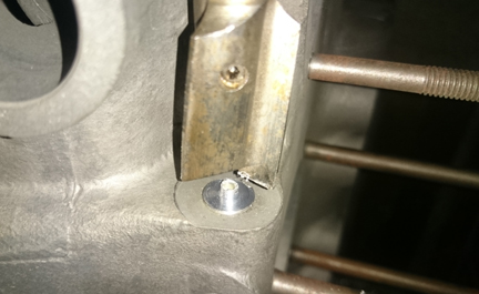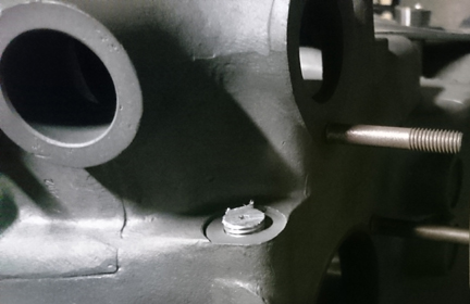 BELOW, LEFT & RIGHT: Here one of the several "soft plugs" can be seen removed on the left image and installed on the right - the plug itself is that silverish disk seen on the right image. As noted in accompanying text, all the soft-plugs had to be removed in order to ensure there was no debris left inside the oil passages. The reason it looks so silver is because it's actually aluminum whereas the crankcase is mostly magnesium.