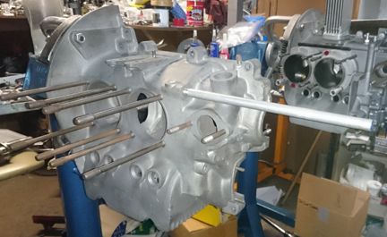 At this point I got a little ahead of myself. One chore I could have but didn't do earlier on was to replate the crankcase! Recall that it has been media blasted. That removes all the protective coating! Well, as I learned on this other two-piece crankcase 356 engine, which you can read about here (there are comments on the plating of the case throughout this page), you can apply plating at any point (even when it's fully assembled!) BUT it makes most sense to apply it at the short-block stage because to apply it earlier will use a lot more product, and using it later is more challenging because of how the process works; at this point, the surface area that needs coating is still relatively easy to get to!