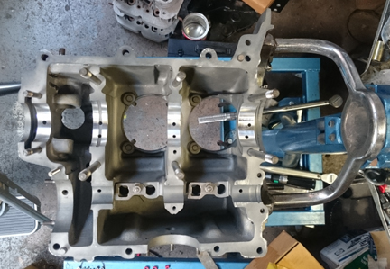 Not forgotten, the cylinder "decks" were checked that they are in one plane with their immediate neighbor using a special tool designed just for this purpose. And, there's a reason for thorough checks like this; in this instance, both halves had a low-spot of between the cylinders. Cylinders 1 & 2 were low in the center by about exactly three thousandths of an inch while cylinders 3 & 4 were low by a little less, at about 0.0025" - very common situation for these older magnesium cases. The specification is 0.1mm, or, about 4 thousandths, so they're within specifications.