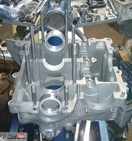 By the way, it's hard to see in the images above but the cylinders are in fact not touched on the surface that seals with the cylinder head by the clamping forces. The spacers between the head nuts and the retaining flanges are under cut so they don't touch the head. If you look at the studs & spacers in the background this becomes more clear.