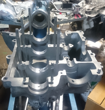BELOW LEFT & RIGHT: A small bit of repeat is the image at left below - just the align-bored case from another angle, however, in this image you can see, if you know where to look, that at least two of the soft plugs have not yet been installed. (Look in the nose area, "below" the fuel pump. In the right image, the bearings are installed to ensure no surprises later.