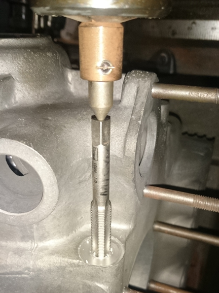 Finally, the rear-most two threaded bores, the ones that accept the forward pulley shroud, had a "bottoming tap" run through them. These threads are a weak spot because they are often stripped by fools who over-tighten the bolts that run in them and the use of too-short fasteners doesn't help. So, I cut a few more threads just to ensure there's no problem later. (Long M6 bolts should be used here - which is good advice anyway.) And, unusually, all of the sump studs are in great condition!