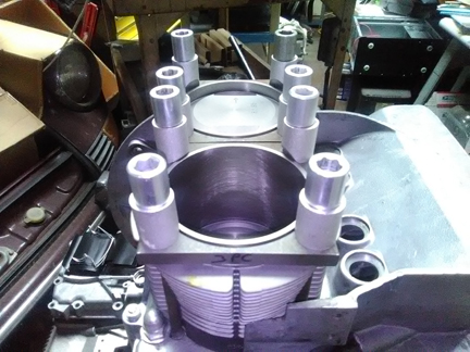 AT RIGHT: The right hand side cylinders (1 & 2) are about to undergo an installed Cylinder Height Check - or CHC, as described in the text. Note how the cylinders are retained with special spacers - these permit the cylinder to be held flat as it will be run in service and a check can be made to ensure that both cylinders top surfaces are in the exact same plane. The book value for tolerated error of installed cylinder height mismatch is 0.1mm, or four thousandths of an inch - the worst on this engine was less than three. ... Alert readers may notice this engine stand is next to a Porsche 911! ... We've gotten some new engine stands and have run out of room in our traditional engine building area!