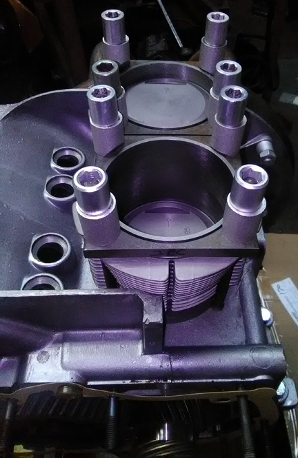 Very Sharp Eyed readers will note that ONE of the upper head nuts is longer than the others and doesn't have a groove down the center! This is an early one - I keep a few on hand. They're longer because they don't take the 2mm washer below them like the later ones do. And, because of their length, they can help solve problems sometimes when heads have been flycut because the nut has to receede so deeply onto the stud, there can be no room for the hex wrench! This longer length helps solve that problem which is why I keep some on hand, just in case! None were needed on this engine, though.
