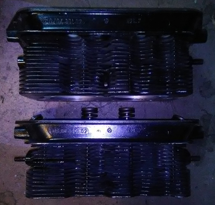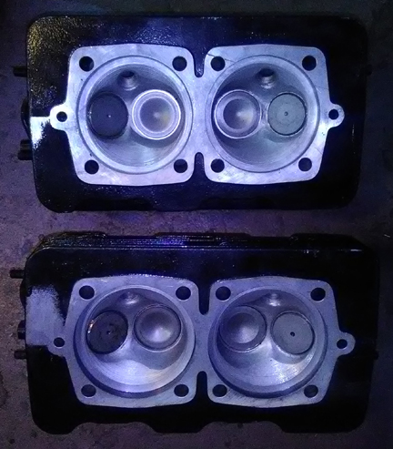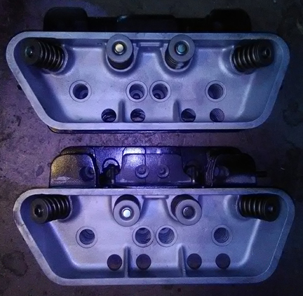 BELOW LEFT & RIGHT: The heads, ready for installation. No broken fins. No loose bits have been through the combustion chambers! And, they've been flycut and decked, including a conical cut to help restore original combustion chamber shape after flycutting. ... Worth mentioning: We always pay attention to the threaded bores on the heads and in this instance, two received thread-repair, including one exhaust stud and one intake manifold bolt hole. The rest were fine.