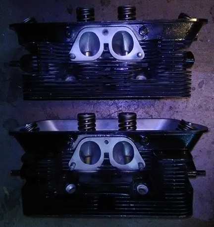 As knowledgeable people will know, SC heads were originally coated with a black coloration to aid in heat disipation. As noted on the web pages describing other SC engines we've built, the original coating is not very durable. In this instance, it looks as though someone has touched-up the black coating on these heads - we didn't do it! But we think it was a reasonable job, so we left it alone. Also as stated elsewhere, our goal is to have a consistent, reliable product, so (as with all our engines) we replaced all the valve guides, used new higher-tension springs, re-faced the valves, ground & lapped the valve seats, and then carefully assembled the valves onto the heads paying special attention to spring-heights. The exhaust valves used here are genuine sodium filled parts, as original on SC (and 912) engines.