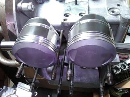 AT RIGHT: A pair of pistons which are going into this engine. They are big-bore (86mm), high compression (9.5:1) pistons fitted to biral cylinders (aluminum fins cast over iron). This is effectively a stock SC set, but with larger displacement. You'll see more of the cylinders in other images here. Note that the rings are removed during this phase of assembly and are only reinstalled during final assembly. ... Alert readers will spot the timing cover in the lower left; note how there are no numbers stamped in! And, a head can be seen lower, right. Finally note that at the time this image was taken, the Compression Ratio was determined and written in ink on the oil cooler mounting flange (9.3:1)