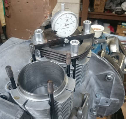 ABOVE RIGHT: Here's an image of checking the cylinder heights for matching their neighbor. The book tolerance is 0.1mm (four thousandths of an inch, 0.004). Because this process measures with cylinders and their shimming installed, torqued, it results in a very acurate and reliable comparison of cylinder heights. In this case the inner edges of cylinders 3 and 1 were both about 0.0015" low, and perfect in all other respects, so they're OK.