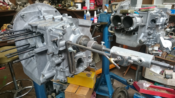 AT RIGHT: This engine (foreground left) is here ready for the align-bore process. The cut is effected by cutters mounted on collets which in turn are mounted to a shaft running through the crankcase supported by two iron fittings mounted to the case. The cutters are rotated via an attachment on the flywheel end, and a slow progression of the cutters axially is effected through the gadget seen foreground right.