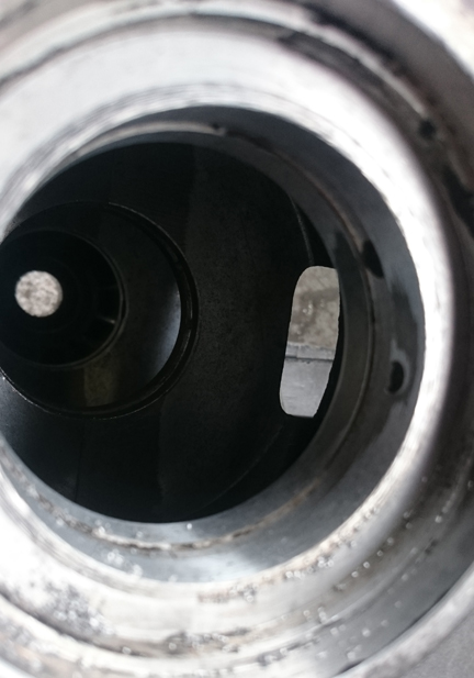 Just for completeness, here's the bit on bearing 1 that didn't quite clean up at first oversize. Note that we know the concentricity of the boring bar to the original bore was practically perfect because the cutter didn't touch either side for bearing 2, so this bit that didn't get cut on bearing 1 we know is a low-spot...