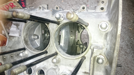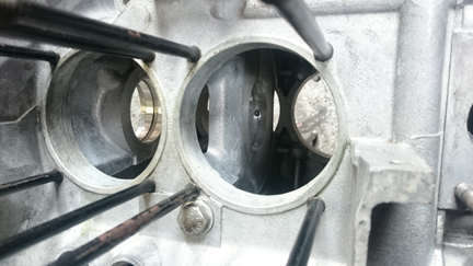 After cleaning, the case was then assembled with full torque and then align-bored to "first oversize." Porsche provided for three official over-sizes, for four total sizes: standard, 1st over, 2nd over, and 3rd oversize, moving from 60.25mm nominal bore up in 0.25mm increments.