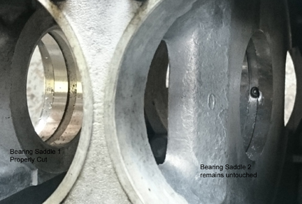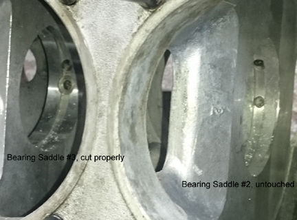 Unfortunately, the results were not great. The saddle for bearing 3 (third from the flywheel) cut cleanly and completely. The saddle for bearing 1 didn't quite clean up completely but I would have lived with it if that were the only issue. However, astonishingly, the saddle for the middle main bearing (bearing 2) had been beaten so hard the cutter didn't even touch the case! WOW!