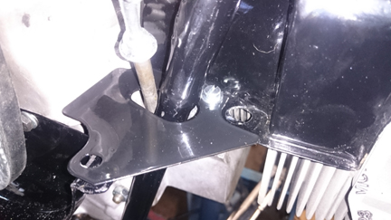 The solution, of course, is to bend the tube into a centered position! However, when the upper cylinder shroud and the small metal foot that provides a spot for the shrouding to be bolted in (here plated "silver", retained by black screws) are mounted, bending the tube to the right spot is inhibited because, due to the nature of metals, you have to bend it past the point you want it and it will "spring back" a bit. Therefore, these pieces must be removed and reinstalled a few times while you iteratively bend the tube and trial fit a few times, confirming it's right, or taking the pieces out and bending again! Do what it takes! (Note that, alternatively, a busy workshop like we have provides an alternative ready solution: Mount an appropriate era generator stand on another crankcase and mount the breather there for bending purposes. This means that only the breather needs to be re-mounted a few times and not the sheet metal and small metal bracket. This saves a lot of time.)