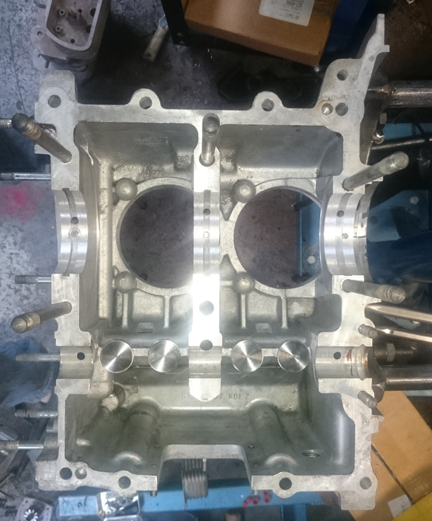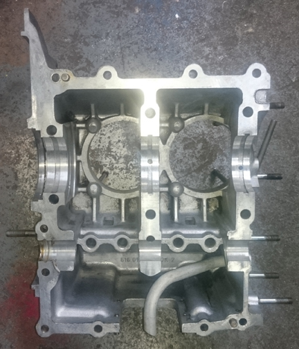 As noted above, the engine had been run pretty hard. It was obvious to the naked eye it was going to need an align-bore, which is a Porsche-approved method of renewing a crankcase; material is cut away to provide a new bearing surface, and a replacement bearing of special size makes up for the removed metal.