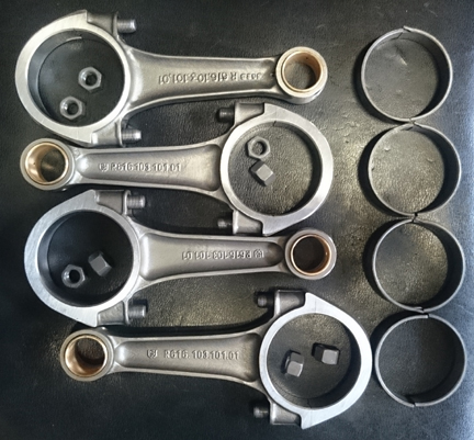 This set was cleaned of oil and the parts weighed. The connecting pins were moved around to make a better balanced set. Three are within 0.1 gram, and one was 0.5 gram lighter. Given that the specification from Porsche for weights within one set is 10 grams, a half gram isn't bad and seemed a shame to have to grind on three of them. So, even though we usually get them all to 0.1gr, we left them alone at 0.5 for the set.