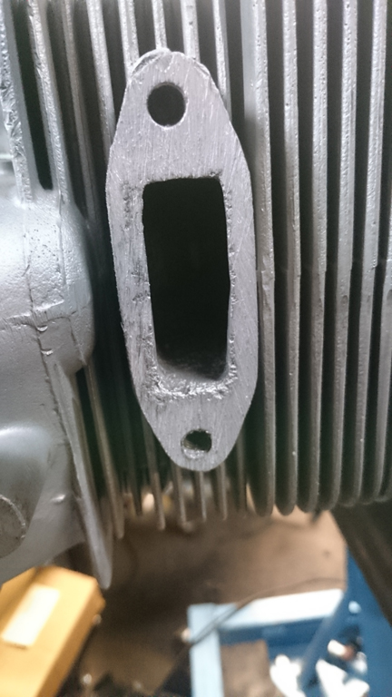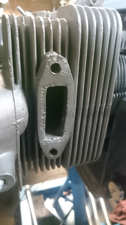 One thing that could have been dealt with earlier but became apparent something should be done at this point was the observation of some port damage on the exhaust for cylinder four. Here, we see the damage and the repair. The solution was to remove the studs and file the surface flat.