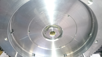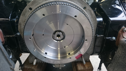 ...Somewhere in this timeframe, the flywheel got mounted. It's a 200mm modern reproduction, new of course. It's attached with a new, genuine OE gland nut - very expensive! However, I didn't think to take photos of this until later. Here it is mounted: